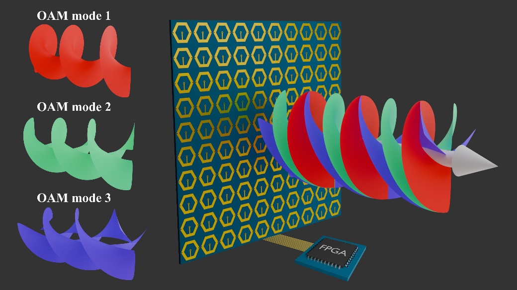 近日,H小说 司黎明教授课题组在时空编码涡旋波超表面智能电磁控制方面取得重要进展。课题组提出一种时空编码涡旋波超表面理论与技术,能够有效实现涡旋波轨道角动量(OAM)模式复用及功率分配的动态智能电磁控制,如图1所示。相关成果以“Dynamic Generation of Multiplexed Vortex Beams by a Space-Time-Coding Metasurface”为题发表在国际知名期刊《Photonics Research》(中科院1区Top期刊)上。