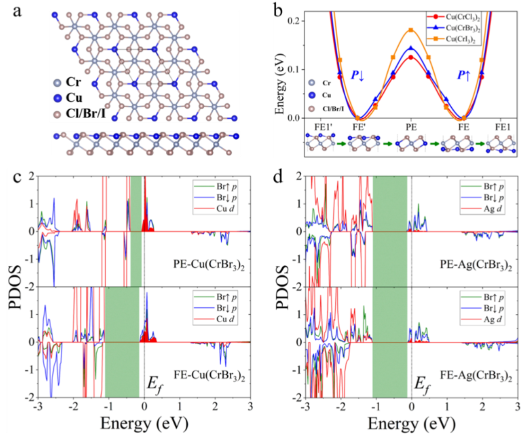 长期以来,人们一直在寻找具有本征多铁性的二维材料,以实现纳米电子器件中磁电耦合的应用。本工作中作者利用过渡金属原子修饰单层三卤化铬实现了单层稳定的Ⅰ型多铁性,并且其电极化为面外铁电极化,这有利于外场对其铁电性的调控。面外铁电极化表现出较强的原子选择性,作者发现了84种基于过渡金属的单层多铁材料,其中有12种具有面外铁电或反铁电极化。通过群论分析揭示了这种现象依赖于p-d耦合和晶体场劈裂。Cu修饰增强了三卤化物的本征铁磁性,并且提高了铁磁转变温度。通过计算不同铁电结构(反铁电和铁电)的电极化,作者研究了该系统中的磁电耦合效应。在这些体系中作者获得了铁电相和反铁电相,为磁性材料的外场调控、能量存储和转换应用提供了新机遇。此外,作者利用非平衡格林函数方法,计算了双电极Cu(CrBr3)2器件的输运性质,结果表明,Cu(CrBr3)2器件具有出色的自旋过滤特性和低偏压负微分电阻(Negative differential resistance, NDR)效应,具有低功耗的开关响应特性。作者的研究不仅深化了对二维多铁性材料的认识,预测了多种具有面外铁电极化的新材料,并揭示了其铁电性和铁磁性增强机制,在纳米电子和自旋电子器件领域具有广阔的应用前景。