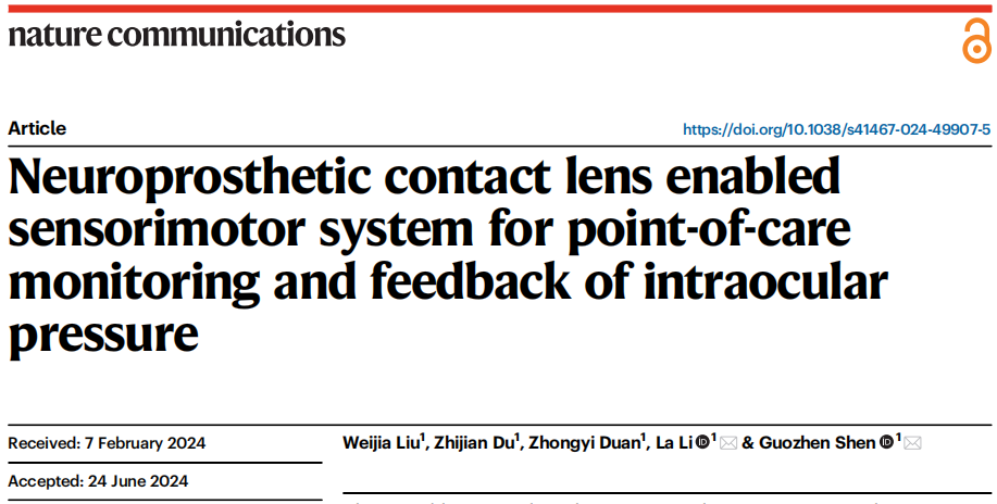 论文详情:WeijiaLiu, Zhijian Du, Zhongyi Duan, La Li* and Guozhen Shen*.Neuroprosthetic contact lens enabled sensorimotor system for point-of-care monitoring and feedback of intraocular pressure.Nat.Commun.15, 5635 (2024).