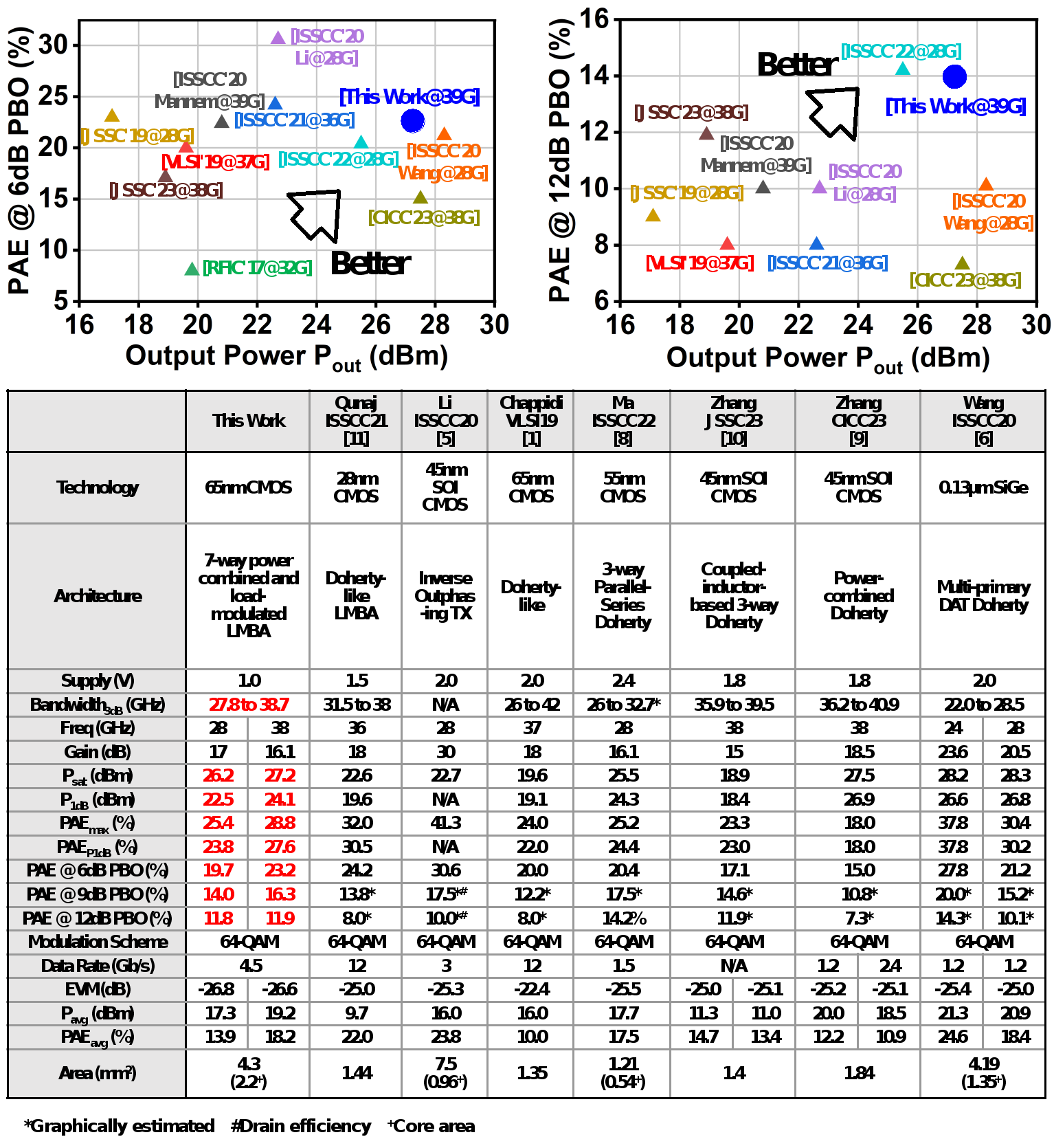 基于上述架构和电路层面的创新,团队研制了一款基于65nm CMOS工艺的7路负载调制平衡功率放大器芯片。测试结果表明,放大器的小信号增益可达18.4dB,在27.2-to-45GHz频带内都实现了较好的端口匹配。该放大器在26-40GHz的频率范围内都达到了大于25.4dBm的饱和功率和大于22%的峰值效率,并展示出卓越的功率回退效率提升和AM-PM线性度。在38GHz频点,放大器实现了17.1dB增益, 在峰值/6/9/12dB回退点效率分别为28.8%/23.2%/16.3%/11.9%。在当前国际上公开报道的工作在30GHz及以上的功率放大器中,该电路实现了最高的峰值效率和功率回退效率。芯片的调制测试结果则证明了该电路可广泛应用于宽带高速无线通信链路中。