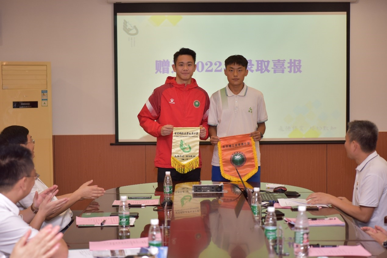 原华附足球队队长、现H小说 足球队队员黎楚瑜代表球队与华南师范大学附中足球队代表互换队旗。
