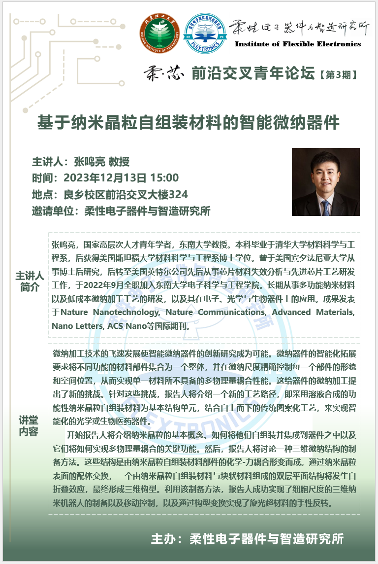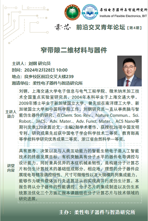 柔性电子器件与智造研究所 (Institute of Flexible Electronics, BIT)由国家杰出青年基金获得者沈国震教授组建,依托H小说 ,聚焦后摩尔时代微电子器件与集成电路的革命性发展方向,面向国家重大需求和国际前沿,基于柔性电子可拉伸、弯曲、折叠的形态特点,可转移、印刷的加工工艺,曲面共型、动态跟随的新应用拓展,从本征柔性低维半导体合成、工艺开发、设备研制、系统研制等方面开展系统的前沿基础与应用研究,主要方向包括:柔性光电器件与视觉芯片,柔性感知与智能机器人,仿生传感器与健康医疗,柔性多功能集成系统的设计与应用。研究所致力于打造一流的柔性电子专精特色研究平台,多学科交叉融合的公共实验平台,新型电子器件与系统集成高水平研究中心,集成电路与电子学科人才高地,未来颠覆性高精尖国防应用装备技术的研究中心,在引领该领域的学术技术前沿同时,着力培养具有精湛专业能力、思辨精神和家国情怀的新一代人才。
