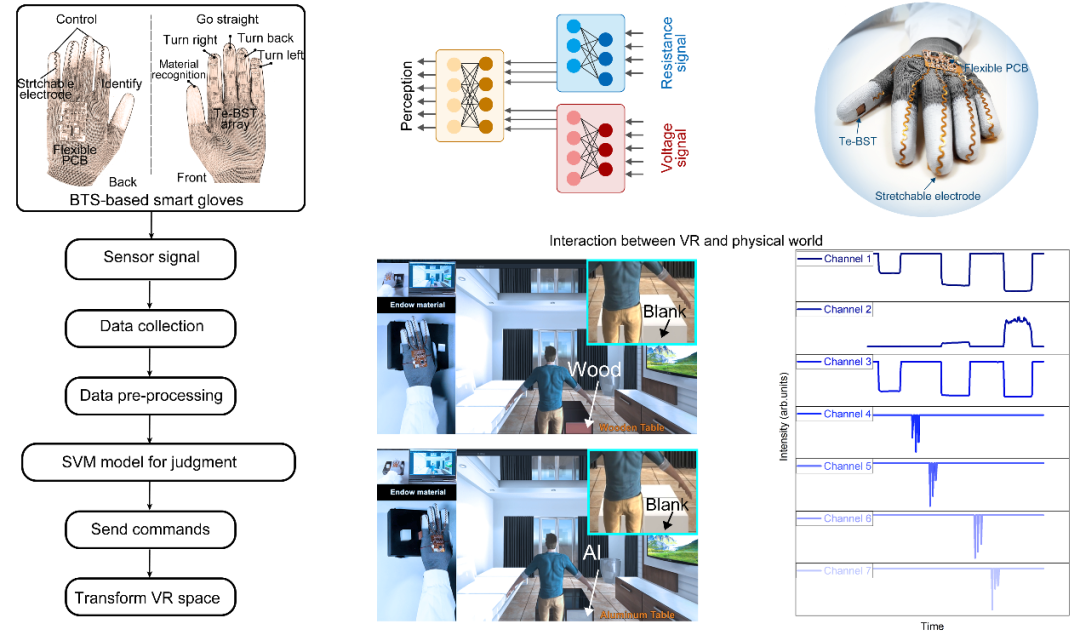 触觉传感器是用于机器人中模仿触觉功能的传感器,也是柔性电子器件中的重要一环,研制满足要求的触觉传感器是机器人发展中的技术关键之一。团队开发了一种可穿戴湿度分析系统,用于环境RH监测和非侵入性人体呼吸监测。此外,该湿度传感器的远程非接触式交互式传感特性被应用于非接触式多级开关和柔性非接触控制屏幕两个人机交互系统中,为未来肌机接口的发展提供重要的科学依据。