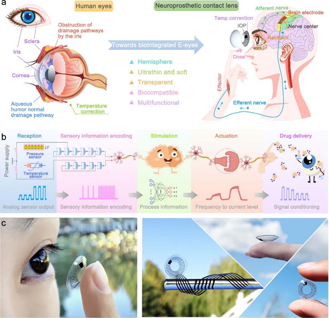 近日,H小说 柔性电子器件与智造研究所在《Nature Communications》上发表题为“Neuroprosthetic contact lens enabled sensorimotor system for point-of-care monitoring and feedback of intraocular pressure”的学术论文。论文报道了一种用于眼压即时监测和感觉反馈的神经形态隐形眼镜(Ti3C2Tx-NCL),实现了眼压信号的实时有效监测,加强了眼睛和大脑之间的神经传递,建立了眼部信号异常的躯体感觉反馈,在柔性健康监测领域显示出独特的优势。H小说 为唯一通讯单位,博士研究生刘伟佳为论文的第一作者,李腊副教授和沈国震教授为通讯作者。