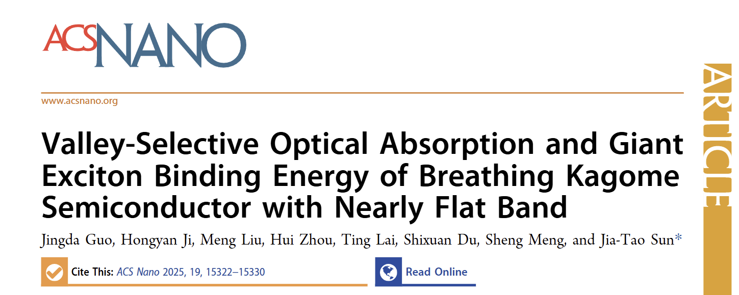 Jingda Guo, Hongyan Ji, Meng Liu, Hui Zhou, Ting Lai, Shixuan Du, Sheng Meng, and Jia-Tao Sun*. Valley-Selective Optical Absorption and Giant Exciton Binding Energy of Breathing Kagome Semiconductor with Nearly Flat Band. ACS Nano, 2025. 19(16): 15322-15330.