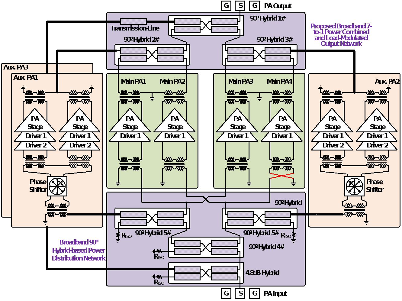 架构层面,在引入多级正交混合网络来增加辅路功放数量的基础上,团队创新性地提出将主路功放的位置挪移至多级正交混合网络前直接连接,形成功放嵌入型宽带正交混合网络,显著改善了架构的简洁性、电路性能和设计优化效率。